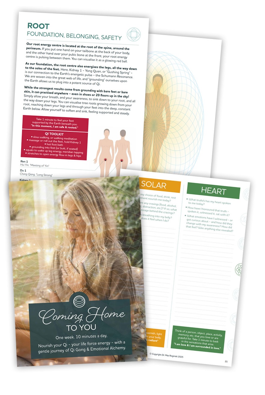 Each day for 1 week, you receive a 5 minute video on each energy centre in your body: how it relates to your health and how you feel, and simple ways that you can charge up your Qi. You will also receive a 5 minute guided Qi Gong Flow video, which takes you through some simple Qi warmups and flows for that energy centre. Each day also comes with a relevant intention and a selection of journal prompts, to help you come home even more deeply to you.
